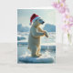 This card shows a polar bear in the Arctic, standing on ice with a Santa hat, looking festive. The bear's white fur shines in the soft light, and it looks like it's splashing joyfully in the water. Its face has a hint of mischief, but also gentleness. The background is calm, with icy mountains and blue waters. The focus is on the bear, giving a feeling of peaceful solitude. It's a mix of nature and holiday joy! This card is perfect for spreading holiday cheer 🎅🏼🎄🎁.