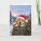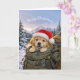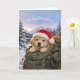 Capture the spirit of adventure and holiday joy with this charming Christmas card featuring a golden retriever puppy nestled in a hiking backpack, wearing a festive Santa hat. Surrounded by a serene snowy mountain landscape with pine trees and a glowing winter sky, this design blends cozy holiday warmth with outdoor exploration. The soft lighting and peaceful wilderness setting create a heartfelt and uplifting scene, perfect for sending Christmas wishes with a touch of nature-inspired charm. A wonderful choice for dog lovers, hikers, and anyone who enjoys the beauty of winter in the great outdoors.