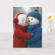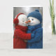 A snowwoman and a snowman, dressed in colorful winter attire, share a warm hug in a snowy forest