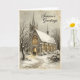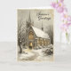 This card feels like a quiet winter evening from long ago. At the center stands a tall Gothic church, its roof and spires covered in fresh snow. Bare trees frame the scene, their pale branches standing out against the dark sky. A narrow, cleared path leads toward the church’s wide arched doorway, guiding the eye inward.