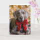A Weimaraner dog with a shiny gray coat wears a large red bow. In the background, decorated white Christmas trees with lights and golden ornaments create a festive ambiance.
