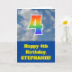 L'avant de cette amusante carte de voeux de 4ème anniversaire présente une représentation d'un ciel bleu nuageux, ainsi que le numéro "4" avec un spectre arc-en-ciel multicolore comme un motif dégradé. L'avant comporte également un message d'anniversaire, y compris un nom de destinataire personnalisable. L'intérieur comporte un message de voeux d'anniversaire personnalisé, ou peut-être pourrait-il être effacé et laissé vide si un message doit être écrit à la main à la place. Une carte d'anniversaire comme celle-ci pourrait être une façon amusante d'envoyer des voeux d'anniversaire à quelqu'un qui célèbre son quatrième anniversaire. [~Z0000370]