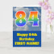 L'avant de cette amusante carte de voeux de 84ème anniversaire présente une représentation d'un ciel bleu nuageux, avec le numéro "84" ayant un spectre arc-en-ciel multicolore comme un motif dégradé. L'avant comporte également un message d'anniversaire, y compris un nom de destinataire personnalisable. L'intérieur comporte un message de voeux d'anniversaire customisé, ou peut-être pourrait-il être effacé et laissé vide si un message doit être écrit à la main à la place. Une carte d'anniversaire personnalisée comme celle-ci pourrait être une façon amusante d'envoyer des voeux d'anniversaire à quelqu'un qui célèbre son quatre-vingt-quatrième anniversaire. [~Z0000370]