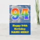 Le devant de cette carte d'anniversaire amusante pour les 94 ans représente un ciel bleu nuageux, ainsi que le nombre "94" ayant un dégradé de spectre d'arc-en-ciel multicolore. Le devant comporte également un message de vœux d'anniversaire, y compris un nom de destinataire personnalisé. L'intérieur comporte un message de vœux d'anniversaire modifiable, ou pourrait éventuellement être effacé et laissé vide si un message doit être écrit à la main à la place. Une carte d'anniversaire personnalisée comme celle-ci pourrait être un moyen amusant d'envoyer un message pour célébrer le quatre-vingt-quatorzième anniversaire de quelqu'un.