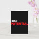 Citation d'humour sarcastique amusante j'avais du potentiel - Carte de vœux .Une esthétique minimaliste avec des détails soignés. Un design subtil avec un attrait intemporel. Un look minimaliste avec une élégance discrète.