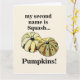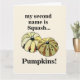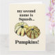 Carte Citrouilles Drôles "Pumpkin Squash" création originale de Nisha Prabhu. Faites sourire vos proches avec notre carte "Pumpkin Squash" aux citrouilles amusantes ! Parfaite pour toute occasion automnale, cette carte est idéale pour envoyer des vœux chaleureux, des invitations ou simplement un mot fantaisiste pour égayer la journée de quelqu'un. Avec des illustrations ludiques de citrouilles et de courges pleines de vie accompagnées d'un message humoristique, cette carte capture l'esprit amusant de l'automne et constitue une carte de vœux mémorable. Que ce soit pour Halloween, Thanksgiving ou simplement pour dire "bonjour", cette carte est parfaite pour partager vos vœux saisonniers ou pour toute occasion spéciale en automne ! Célébrez la saison des récoltes et de la joie avec notre carte "Pumpkin Squash" aux citrouilles drôles
