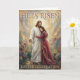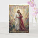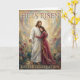 Celebrate the beauty of resurrection hope with this exquisite Easter card featuring the risen Jesus robed in white, standing in a garden bursting with blossoms and new life. At His side, a woman in a flowing red gown with a gold sash clings to Him in awe and love, while swirls of vivid color encircle them like waves of living glory. The scene captures both the tenderness of being held by Christ and the triumph of His victory over the grave. Inside, a heartfelt blessing invites the recipient to rest in the joy, peace, and unshakable hope that only the risen Lord can give.