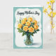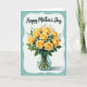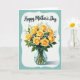 This card features an illustrated bouquet of sunny yellow roses arranged closely together like a caring hug ❤️. Soft green leaves and tiny white filler flowers weave between the blooms, adding a gentle, friendly closeness to the scene. The flowers sit in a clear glass vase with water, and the green stems show through the glass for a natural, down-to-earth touch. A soft, cloud-shaped white border frames the bouquet and separates it from a muted teal background that feels calm and steady. Centered near the top, the text reads “Happy Mother’s Day” in dark lettering that stands out clearly against the lighter space. The lighting looks soft and warm, catching small highlights on the vase and subtle shading along the rose petals 🌼. The white border has rounded, softly uneven edges against the teal background.