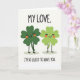 This design shows two four-leaf clovers standing close together on a softly shaded oval “ground,” like they’ve stepped into a quiet little moment just for each other 💚. One clover is a deeper emerald green while the other is a lighter, springy lime, and their colors contrast gently against the off-white background. They wear small, upward smiles with closed, content eyes, and each has bright orange blush circles that make their faces look sweetly bashful, as if they’re sharing a private joke ☘️. Their thin stems and stick-like legs lean subtly inward, adding to the sense of closeness and easy friendship. Centered near the top, the words “MY LOVE.” appear in a dark, hand-drawn lettering style, leaving plenty of open space around it. Along the bottom, “I’M SO LUCKY TO HAVE YOU.” is placed in the same dark lettering, balancing the layout beneath their feet. Soft, even lighting keeps the scene gentle, and the oval shadow under them anchors the two clovers side-by-side.