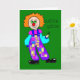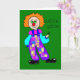 Un clown animé et joyeux frappe sur une porte verte avec un voeu d'anniversaire.