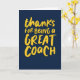 Merci d'être un excellent entraîneur ! Cette carte élégante et amusante est une excellente façon de montrer votre appréciation pour une saison sportive réussie. L'arrière - plan est une marine classique avec des lettres dorées mais peut être changé en cliquant sur "customiser plus loin". L'intérieur comprend du texte personnalisable et beaucoup de place pour toute l'équipe à signer si nécessaire. Idéal pour les sportifs petits et grands !