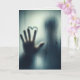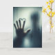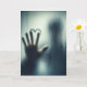 La main d'un homme est pressée contre un verre brumeux avec une forme cardiaque dessinée sur la condensation pour l'anniversaire. Le texte intérieur peut être modifié.