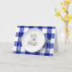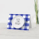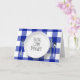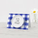 Commande Alexa humoristique sur une assiette blanche avec couverts sur un fond à carreaux bleu et blanc de style plaid buffalo pour anniversaire.