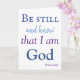 Une carte qui apporte le confort, le devant dit "Soyez calme et sachez que je suis Dieu" Psaume 46:10. Ce texte est écrit en joli texte bleu et violet.