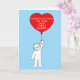 A large white fluffy kitten holds a large red, heart shaped balloon that has written on it 'Congratulations on your new family member'.