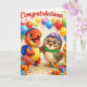 Description say a big well done with this vibrant and cheerful congratulations greeting card perfect for graduation school achievements or any proud moment it features a happy dinosaur with a backpack and an owl wearing glasses and a green scarf celebrating under a sky of colourful balloon balloons the festive scene complete with confetti and gift boxes is designed to bring a smile to anyone's face