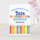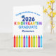This cute 2026 kindergarten graduation card features a cool grad cap above colorful writing and a row of crayons in rainbow. Customizable kindergartener graduate congratulations card in fun colors for the last day of elementary school with your kid's name personalized in blue. Congratulations to our kinder grad!