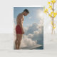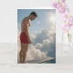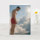 A man in bright red shorts stands boldly on a diving board high among the clouds, bathed in warm sunlight that enhances the sense of exhilaration and serenity.