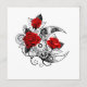 Contour, lune de croissant mécanique avec des engrenages, décoré de roses rouges avec des tiges noires spirées et feuilles sur arrière - plan blanc. Steampunk