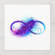 Infinity symbole with a beautiful feather painted in purple and blue bright colors on white background