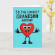 This greeting card features a teal background with a big, red heart character in the middle wearing white sunglasses. The heart has a silly, friendly expression with its tongue sticking out, and its short black arms and legs are spread wide like it’s showing off. Little yellow lines above the heart add a sunny, excited look to the scene. Across the top, the text reads “TO THE COOLEST GRANDSON AROUND” in rounded black letters that look simple and easy to read. The message sits high on the card, leaving the heart character to take center stage underneath it. It feels like a fun way to tell your grandson you adore him and enjoy his personality, with just the right touch of humor 🥰. It’s the kind of card that can make someone smile right away and feel loved ❤️