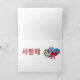 "사랑해" - "Je t'aime" en coréen. Offrez cette charmante carte pour la Saint-Valentin ou chaque fois que vous souhaitez exprimer votre amour. Des cœurs faits de tiges de fleurs flottent au-dessus d'un fond de rubans rouges et dorés.