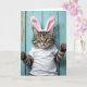 This card shows a close-up portrait of a striped tabby cat facing forward, dressed in a bright white t-shirt and a soft headband with pink-lined bunny ears 🐰. Its golden-green eyes meet yours with a curious, slightly teasing look, like a friend leaning in for a shared joke. The cat’s front paws are lifted near its chest, adding a gentle, almost hug-like pose that reads as affectionate and inviting 🐇. Behind it, vertical wooden panels form a rustic backdrop painted a faded teal-blue, with worn areas revealing warmer earthy tones underneath. Soft, diffused light highlights the detailed fur markings, long whiskers, and the small rose-colored nose at the center of the face. Near the top, the main text sits centered in a simple dark tone that stands out against the pale background. The pink inner ears on the headband contrast softly with the teal boards and the cat’s white shirt.