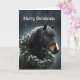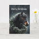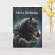 Beau Cheval Noir dans un pâturage avec une couronne de Noël autour du cou. Parfait pour tous ceux qui aiment les chevaux