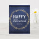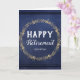 De jolies polices élégantes disent "Joyeuse retraite !". À l'intérieur de la carte, le texte est réglable avec un message de félicitations. Fond bleu avec une simple couronne de feuilles en faux or en relief.