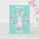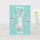Un petit lapin gris mignon est assis à l'intérieur d'une couronne florale rose, blanche et verte sur le devant de cette carte de vœux de Pâques. Le texte Joyeuses Pâques est en blanc en haut et en bas. L'image et le texte sont placés sur un fond sarcelle pastel printanier. L'intérieur de la carte contient votre texte personnalisé de la même couleur sarcelle, et une autre image du lapin avec une brouette de fleurs.
