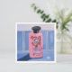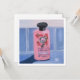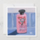Impression artistique d'une bouteille de shampooing rose sur carrelage bleu.