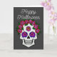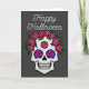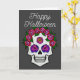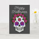 Une carte de vœux représentant un crâne peint à la main avec des roses de couleur arc-en-ciel sur fond gris foncé avec les mots Joyeux Halloween sur le devant. L'intérieur indique « Que tous vos souhaits effrayants se réalisent. »