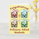 Félicitez le nouveau chef dans la ville, avec cette carte mignonne pour le diplômé d'école d'arts culinaires, classe de 2015. Les caractéristiques de conception quatre crânes tourbillonnants colorés différents de chef, rouge, bleu, vert et or, avec des yeux en forme de coeur, et une cuillère en bois.