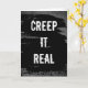 Une carte d'Halloween en noir et blanc avec l'expression "Creep It Real". Parfait pour envoyer des salutations éffrayantes avec un sens de l'humour. Idéal pour les amis, les collègues ou toute personne qui aime les puns d'Halloween ludiques. L'intérieur de la carte peut être personnalisé en quelques clics seulement.