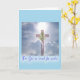 Cette carte a ma représentation d'une croix dans les nuages, rétro-éclairée par un rayon de soleil, dans un cadre bleu ciel avec le texte "Pour Dieu si aimé le monde" éditer à l'intérieur du texte qui dit, "Souvenez-vous de la promesse avec joie dans votre coeur".