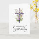 Belle carte de sympathie avec une aquarelle peinte de fleurs violettes sur une croix chrétienne, et le texte "Avec la plus profonde sympathie" sur le devant. Texte personnalisé à l'intérieur : "Nous sommes tellement désolés de votre perte. Puissiez-vous trouver paix et confort pendant cette période difficile"