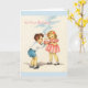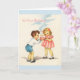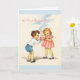 Une image de carte d'anniversaire de cru comporte deux enfants en bas âge. Le garçon remet un gâteau d'anniversaire rose avec les bougies allumées à la petite fille qui porte sa robe habillée assez rose. L'avant de la carte indique, "il est votre anniversaire !" et le message à l'intérieur de la carte est, le "amusement et amis d'espoir viendront à votre rencontre avec l'amour et joie votre jour spécial."