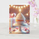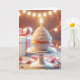 Un cupcake joliment décoré avec une bougie éclairée est posé sur un piédestal, entouré de décorations festives comprenant des cadeaux et des lampes à cordes. Tout le texte peut être modifié.