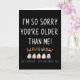 Célébrez l'anniversaire de votre meilleur ami avec cette carte de voeux charmante et humoristique. Orné d'adorables cupcakes et de bougies d'anniversaire vibrantes et scintillantes, il donne le ton parfait pour une fête joyeuse et légère. La carte dit avec joie : "Je suis tellement désolé que vous soyez plus âgé que moi. Je plaisante que j'aime ça pour vous." Ce message plein d'esprit et d'humour reconnaît habilement la différence d'âge entre vous et votre meilleur ami. C'est un témoignage de la dynamique unique de votre amitié et de votre capacité à embrasser les bizarreries et les jalons de l'autre avec amour et rire. L'humour de la carte est sûr d'apporter un sourire au visage de votre ami et de créer une expérience d'anniversaire mémorable et joviale. Ouvrez la carte pour révéler un intérieur vierge, offrant un espace suffisant pour que vous puissiez écrire un message personnalisé à votre ami bien-aimé. Profitez de cette occasion pour express votre appréciation pour leur amitié, vous rappeler des souvenirs partagés, ou mettre en valeur les qualités qui les rendent si spéciaux pour vous. La polyvalence de l'espace vide vous permet de personnaliser votre message pour refléter le lien unique que vous partagez, en vous assurant que vos mots résonnent profondément et créent une connexion sincère.