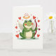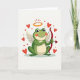 This Valentine’s Day greeting card features an adorable frog dressed as Cupid, centered on a bright white background. The frog is green with a creamy belly, big shiny eyes, and a wide smile, with soft pink blush on its cheeks that adds extra charm. Small white feather wings rest on its back, and a golden halo floats just above its head. In its hands, the frog holds a deep red bow and a matching arrow, ready to send love in your direction. Red hearts in different sizes float around the frog, filling the space with affection ❤️💌. There is no text on the front, letting the illustration share the message on its own. It’s a sweet, cheerful card that works beautifully for Valentine’s Day, romance, or a kind note to someone you care about