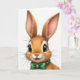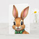 Designed with a close-up view of a young rabbit-like creature set against a bright white background, the face fills most of the card for an intimate, friendly feel 🐰. Soft, diffused lighting highlights fluffy amber fur and fine strands around the cheeks, while the inner ears fade into gentle pink tones. Big glossy eyes with long lashes catch tiny points of light, and the slightly open smile reads like a shy greeting shared between close friends. A shiny emerald-green bow tie sits neatly under the chin, paired with a matching strand of round beads that adds a dressed-up touch. Any greeting text is best placed above the ears in a simple green font, with a smaller line below the chin to balance the layout 🌷. Thin whiskers spread outward from a small rounded nose, all sharply defined against the white space, and the tall ears reach up near the top edge of the design.