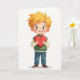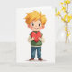 This greeting card shows a young boy standing front and center on a plain white background, holding a bright red heart close to his chest. He has spiky golden hair, wide brown eyes, rosy cheeks, and a big, happy smile that feels full of kindness. He’s wearing a forest-green sleeveless sweater over a cream long-sleeved shirt, along with cuffed blue jeans for a relaxed look. The heart is the main focus, shining in a strong red color that clearly stands for love and caring. Soft lighting gives the boy and the heart a gentle glow without any harsh shadows, keeping the scene calm and sweet. ❤️❤️🍫