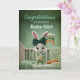 Celebrate a new baby girl with this adorable bunny design in a cozy green nursery. A soft, calming color palette and sweet details make it a unique and charming way to welcome a little one and send your well wishes to the happy new parents.