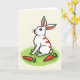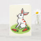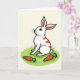 This card features a simple illustration of a white rabbit with crimson-orange markings along its side and inside its upright ears, outlined in thick black lines for a friendly, animated look 🐰. The rabbit sits on a rich green patch of grass, angled slightly as it gazes to the left with a soft eye that suggests a gentle, affectionate mood. In the foreground, two bright orange carrots with leafy green tops rest close together, like a small shared treat set out for a companion 🥕. A creamy, pale background keeps the focus on the rabbit and carrots while making the warm orange and fresh green colors stand out. Any text would sit neatly near the top in a warm orange tone, with a smaller line near the bottom in dark gray to balance the composition. The even lighting and smooth shapes give the scene a calm, cozy setting that feels like a quiet moment meant to be noticed by someone special. Two vivid carrots lie side by side at the lower front edge, their green tops fanning upward against the cream backdrop 🌷.