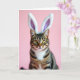 This design shows a tabby cat posed against a soft, single-tone pink background, wearing oversized white faux-fur bunny ears with pale lavender inner panels 🐰. Its coat mixes warm browns, deep blacks, and creamy whites in detailed stripes that feel cozy and familiar, like a close companion curled nearby. The cat’s golden-green eyes meet yours with a gentle, curious look that reads like quiet affection rather than mischief. A bright white patch of chest fur stands out at the center, and long white whiskers fan from the muzzle like fine threads. Subtle, even lighting smooths the scene and brings out the plush texture of the ears and the layered fur patterns without harsh shadows. There’s no visible headline or message on the front, leaving the portrait to do the talking 🌷. The only elements in view are the cat, the fluffy ears, and the uninterrupted pink backdrop.