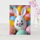 Designed with an intimate close-up focus, the front features a white, egg-shaped bunny figure with upright ears and a sweet, friendly face 🐰. Simple dark round eyes, fine black whiskers, and a heart-shaped pink nose give it a gentle look, like it’s leaning in for a quiet moment with someone close. Around the bunny, a cluster of colorful egg-like shapes gathers tightly, creating the feel of a shared springtime treat or a friendly circle. The background fades into a soft blur of pastel yellow, peach, mint green, and sky blue, keeping attention on the bunny’s face while the colors glow behind it 🌷. Soft, even lighting smooths the contours and adds a tender shine to the rounded surfaces. You can spot different textures in the mix, including glossy finishes, dotted patterns, and a fuzzy pink sphere that sits among the smoother shapes. Near the top, the greeting appears in light pink lettering, while the lower area is filled with softly out-of-focus eggs in yellow, peach, mint, and blue.