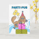 Partype ! Carte de voeux d'anniversaire mignonne et drôle avec une illustration d'un platypus enveloppant des cadeaux d'anniversaire et tenant des ballons étoiles. Message de jeu de mot de platypus mignon écrit à l'intérieur. copyright © Shoaff Ballanger Studios, 2025.