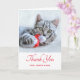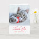 Carte de Noël avec une mignonne photo de Noël d'un chat tabby gris mordant joyeusement un chapeau santa rouge. Ses gros pattes moelleuses rendent cette photo très agréable.