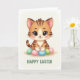 Designed with a sweet, stylized kitten as the main character, shown in caramel and cream tones with gentle tabby stripes. Its large shining eyes catch the light, and the softly blushed cheeks and tiny rosy nose give it a tender, friendly look, as if it’s gazing at someone it trusts. Around the kitten’s paws sit smooth oval eggs in mint green, baby pink, and sky blue, adding a seasonal touch 🌷. The background stays pale with a faint texture, letting the warm fur colors stand out without distraction. Near the bottom, a short Easter greeting appears in solid green lettering, centered and easy to read 🐰. The lines are soft and flowing, and the eggs have small highlights that make them look slightly glossy. A light glow surrounds the kitten, with the green text resting just below the cluster of pastel eggs.