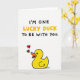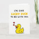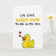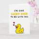 This cute card is all about showing love and friendship in a simple and heartfelt way. It's not complicated or fancy, just really sweet and warm. In the middle, you see big letters saying "I'M ONE LUCKY DUCK TO BE WITH YOU," with "LUCKY DUCK" standing out in bright yellow against the black writing around it. That splash of color really catches your eye and makes the message even more cheerful. At the bottom, there's a cute yellow rubber duck outlined in black, with an orange beak that looks like it's trying to say something nice. Two little red hearts float nearby, adding an extra touch of love to the scene.